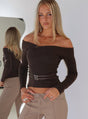 Ellenore Belt Detail Off Shoulder Top Brown is backordered and will ship as soon as it is back in stock.